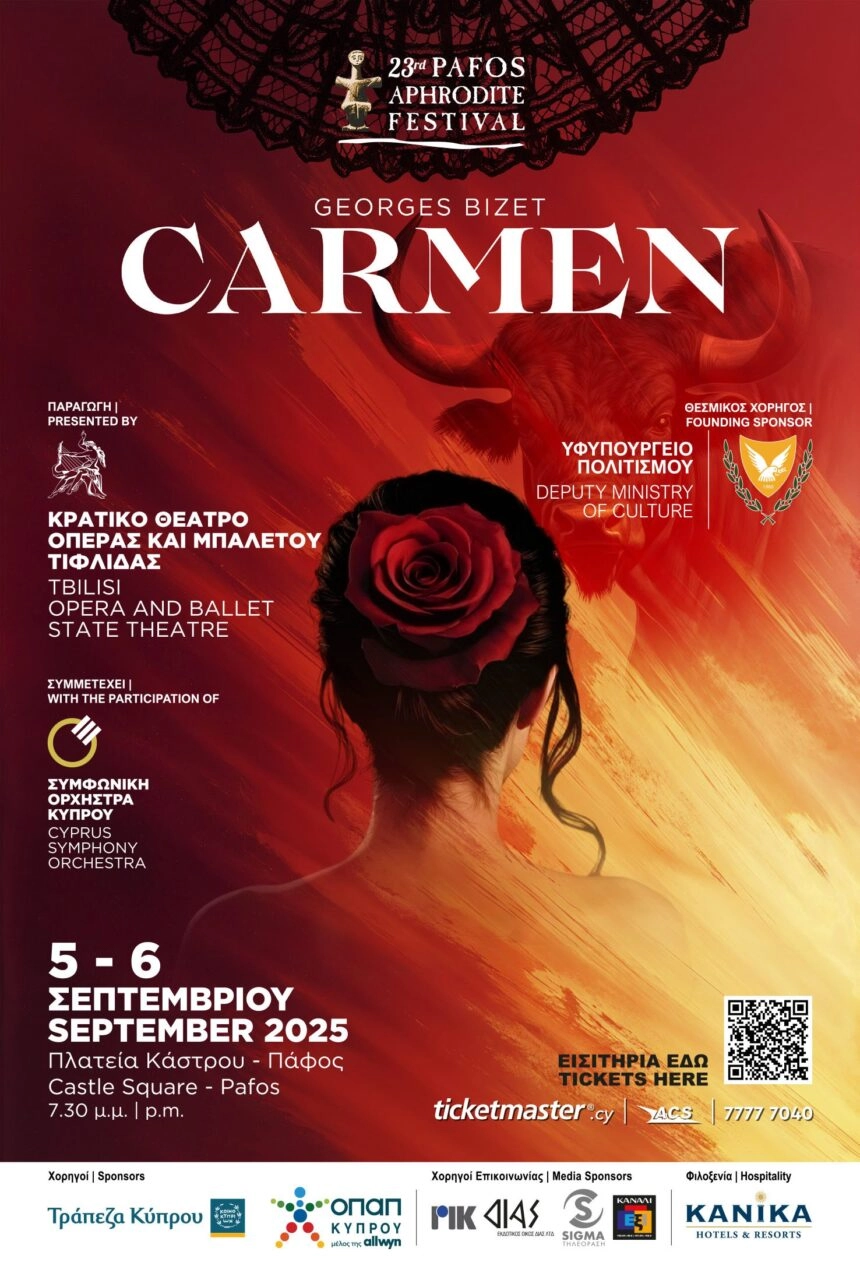 Στις 5 και 6 Σεπτεμβρίου, στο πλαίσιο του 23ου «Φεστιβάλ Αφροδίτη Πάφου», το Κρατικό Θέατρο Όπερας και Μπαλέτου της Τιφλίδας (Γεωργία), στην δεύτερη συνεχόμενη εμφάνισή του στο Φεστιβάλ και σε σύμπραξη με τη Συμφωνική Ορχήστρα Κύπρου, θα παρουσιάσει δύο παραστάσεις της όπερας Κάρμεν του Ζωρζ Μπιζέ – μιας από τις πιο εμβληματικές και αγαπημένες όπερες όλων των εποχών. Οι παραστάσεις θα πραγματοποιηθούν στο εντυπωσιακό σκηνικό της Πλατείας του Μεσαιωνικού Κάστρου της Πάφου.