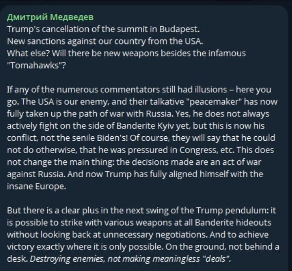 «Αν κάποιος από τους πολυάριθμους σχολιαστές είχε ακόμα αυταπάτες, ιδού. Οι Ηνωμένες Πολιτείες είναι ο αντίπαλός μας και ο φλύαρος “ειρηνοποιός” τους έχει πλέον ξεκινήσει πλήρως το πολεμικό μονοπάτι εναντίον της Ρωσίας.