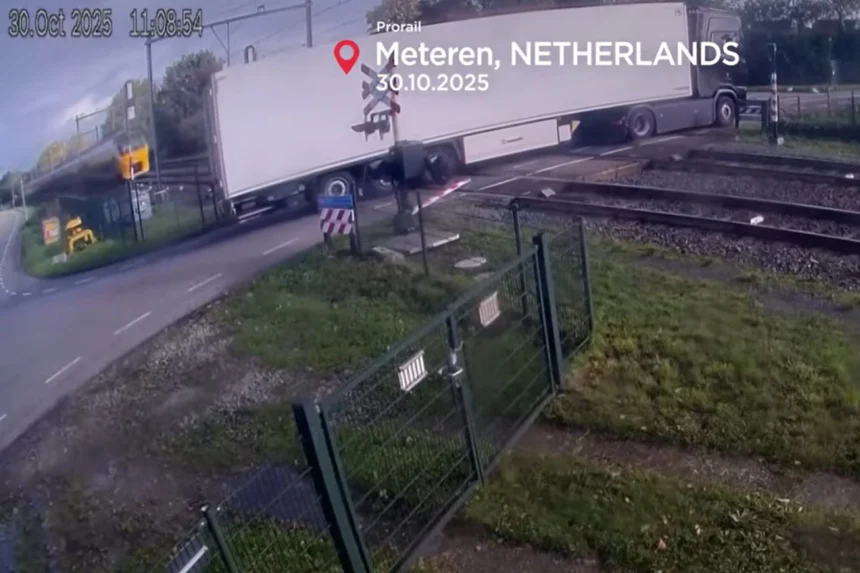 Τη δραματική σύγκρουση ενός επιβατικού τρένου υψηλής ταχύτητας με ένα φορτηγό σε ισόπεδη διάβαση κατέγραψε κάμερα κλειστού κυκλώματος στην Ολλανδία.