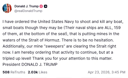 Σύμφωνα με όσα αναφέρει, έδωσε εντολή στο αμερικανικό Πολεμικό Ναυτικό να στοχοποιεί και να καταστρέφει κάθε σκάφος που επιχειρεί να τοποθετήσει νάρκες, ανεξάρτητα από το μέγεθός του. Υποστήριξε επίσης ότι εχθρικές ναυτικές δυνάμεις έχουν ήδη εξουδετερωθεί, κάνοντας λόγο για 159 πλοία στον βυθό, ενώ ζήτησε μηδενική ανοχή και εντατικοποίηση των επιχειρήσεων.