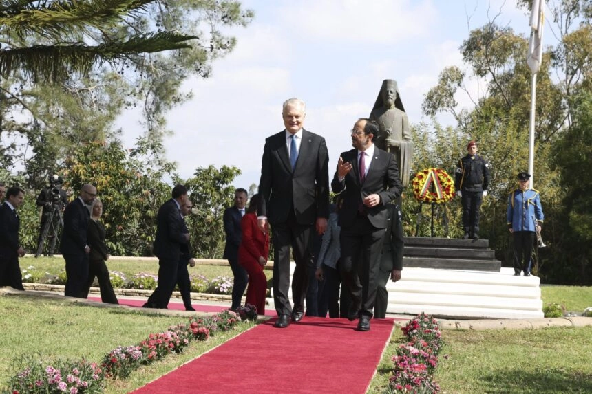 Ο Πρόεδρος της Λιθουανίας έφθασε το πρωί στο Προεδρικό Μέγαρο, όπου τον υποδέχθηκε ο Πρόεδρος Χριστοδουλίδης, ενώ στρατιωτικό άγημα απέδιδε τιμές.